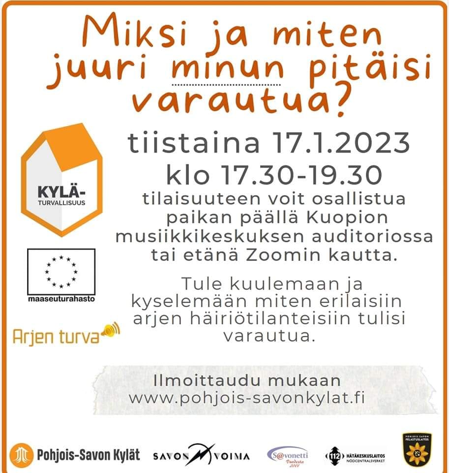 Varautuminen arjen häiriötilanteisiin Milloin 17.01.2023 17:30 - 19:30 Add To Calendar Download ICS Google Calendar iCalendar Office 365 Outlook Live Missä Nissilän rivitalot Nissiläntie 1562 A 2, Nissilä, 74250 Event Type arjen turva, varautuminen Voit osallistua tähän tilaisuuteen myös yhdistyksen järjestämällä etäyhteydellä Nissilän rivitaloilla!Ilmoittaudu mukaan puh 045 117 6885 / Tuula
